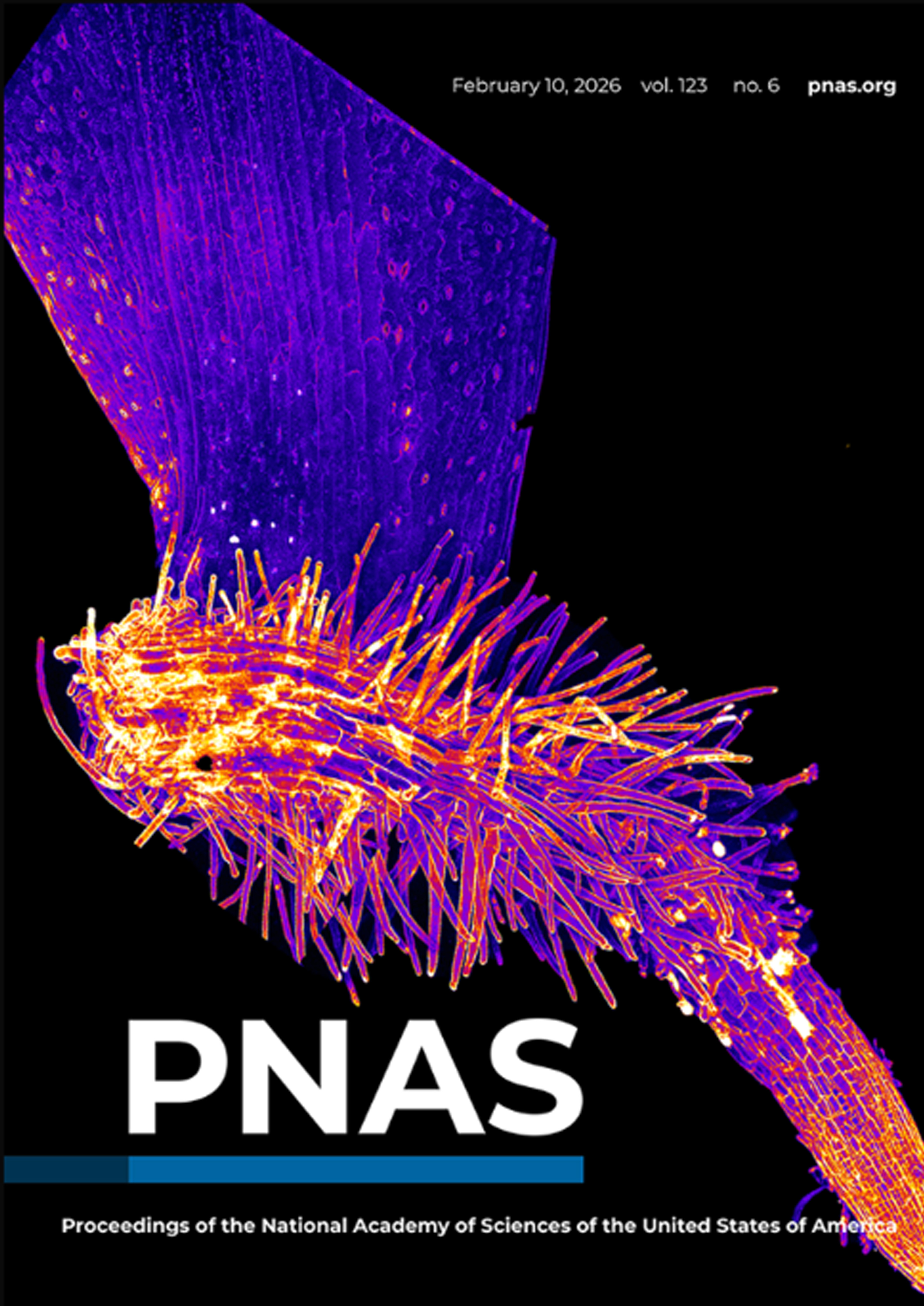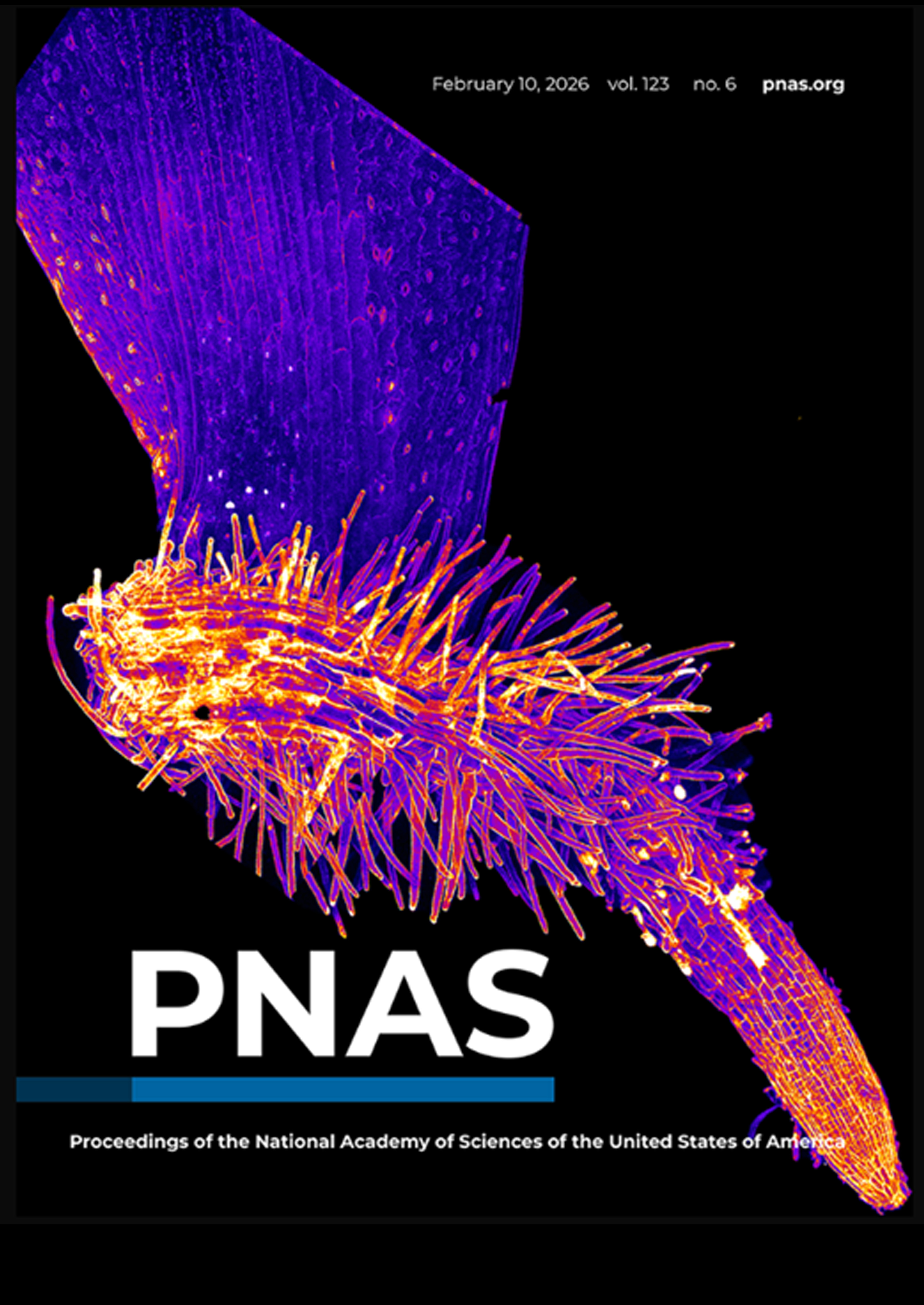 On the cover: Pictured is a regenerating root from an Arabidopsis thaliana leaf. Akansha Ganguly et al. detached plant leaves to study the mechanisms of stress mitigation associated with wound repair. The authors found that plant-specific PLETHORA transcription factors activate the ATG8 gene, which initiates recycling of damaged cell components to decrease intracellular stress and allow stem cells to differentiate. ATG8 is not activated if the plant is simply forming a callus, rather than regenerating roots. The results reveal how plant-specific autophagy regulators interact with intracellular stress signaling to aid in wound repair. See the article by Ganguly et al., e2513954123. Image credit: Akansha Ganguly.