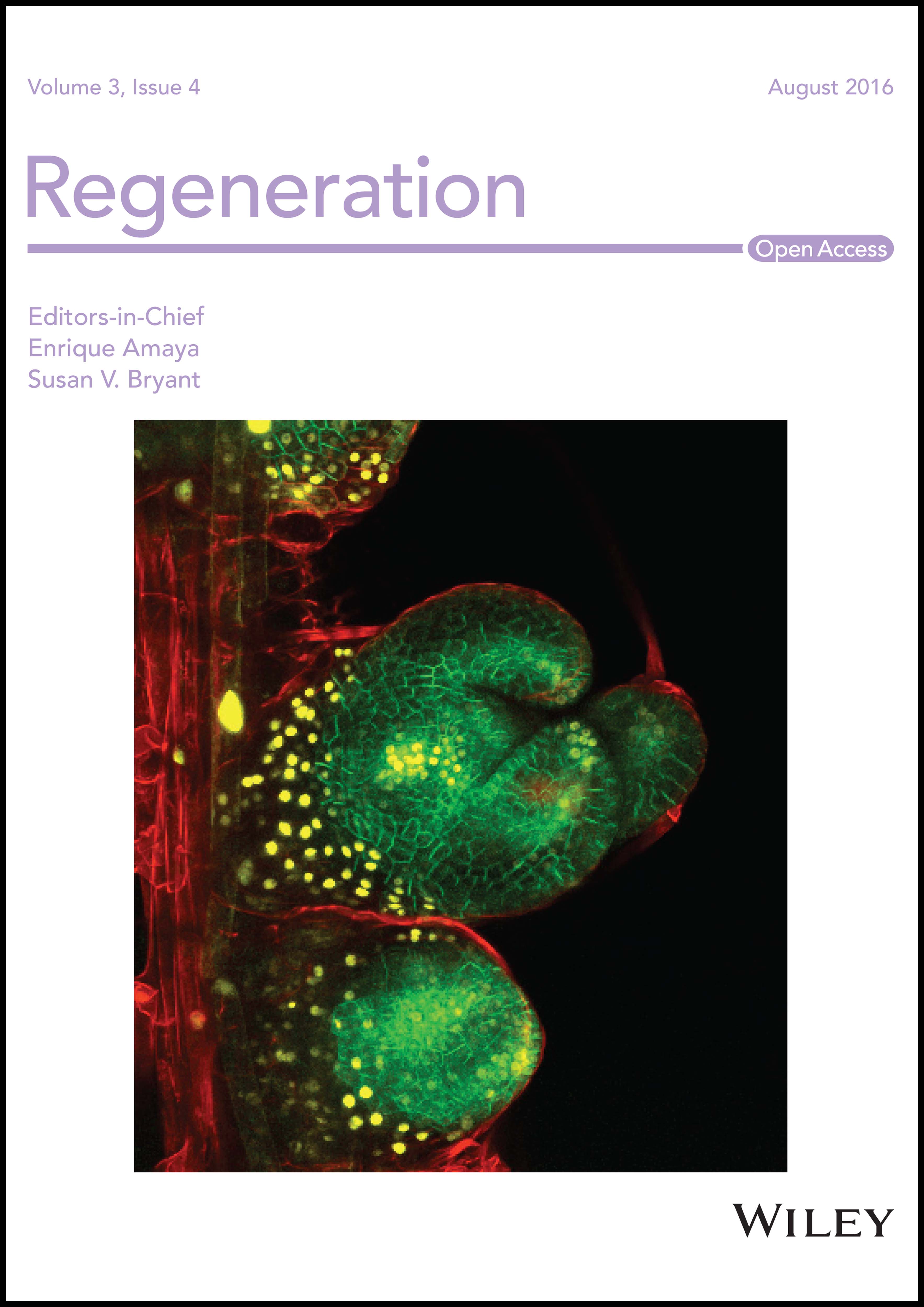 On the cover: Regenerating shoot from lateral root primordia in Arabidopsis. Merged confocal micrographs show the expression pattern of GFP tagged polar auxin efflux carrier PIN-FORMED1 (PIN1) membrane protein (green) and venus-YFP tagged auxin response sensor DR5 (yellow) in shoot primordia after inductive cues. In this issue, Kareem et al. (Regeneration 2016; 3(4):182–197) review the recent advances in understanding the molecular mechanism of de novo plant regeneration. Image by Abdul Kareem at IISER